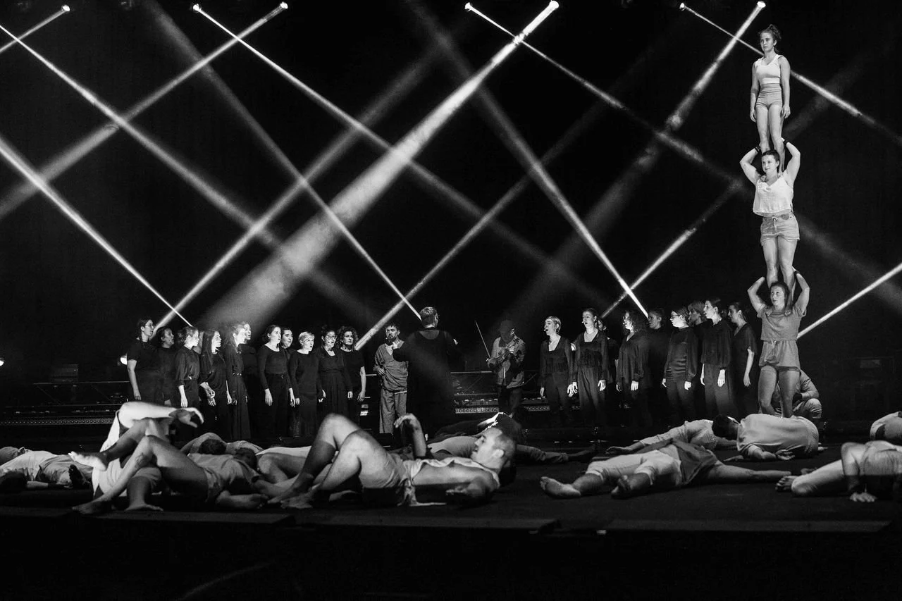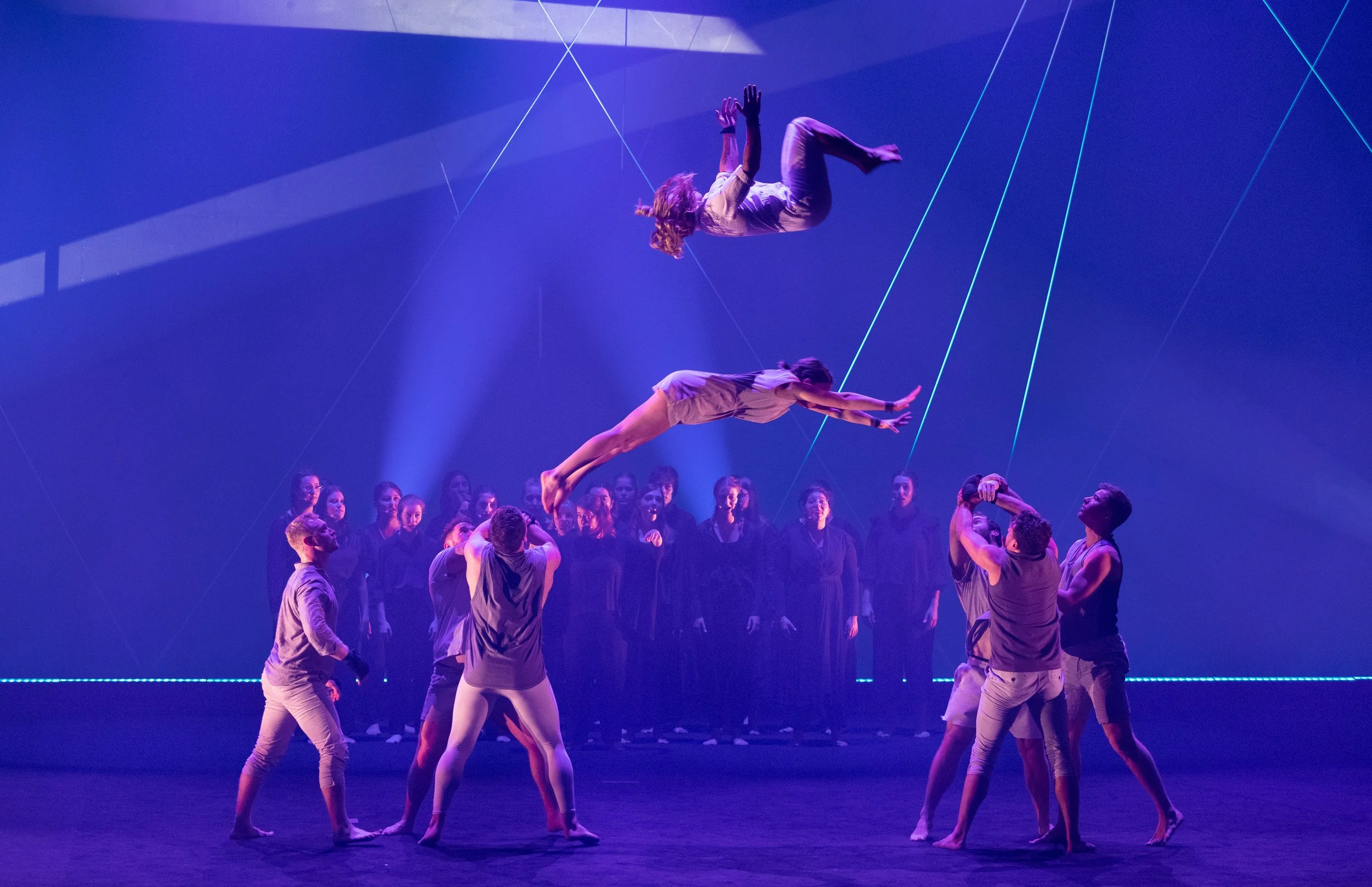 When the 30-strong Gravity & Other Myths troupe did start performing on stage, minimal lighting meant the audience had to focus intently to make out their movements, but soon their perfectly synchronised – and often gasp-inducing – routines were beautifully spotlit against the backdrop of rising and falling voices of the choral singers moving among them.